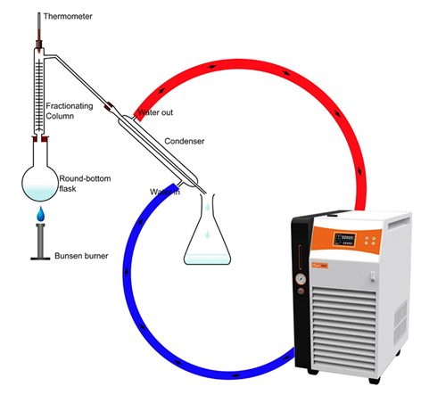 در این سیستم، مایع خنک‌کننده به وسیله پمپ به کندانسورها، دستگاه‌های تقطیر، یا نمونه‌های آزمایشی منتقل می‌شود. سپس پس از جذب گرما، مجدداً به مخزن بازمی‌گردد تا توسط گاز خنک‌کننده R134a و رادیاتور داخلی، به دمای اولیه بازگردد. این چرخه به صورت مداوم ادامه دارد تا دما در مقدار مورد نظر ثابت بماند.