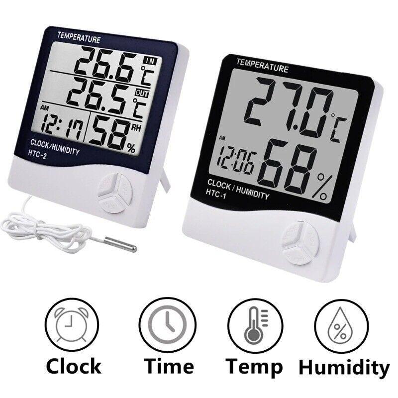 دماسنج رطوبت سنج HTC-2 نیز برای اندازه گیری دما و رطوبت محیط بکار می رود. این دما سنج دارای دو سنسور دما و یک سنسور رطوبت داخلی می باشد. سنسور دمای اول داخلی بوده و سنسور دمای دوم دارای سیم 1.5 متر می باشد. این ترمومتر دیجیتال محیطی بصورت رومیزی و یا دیواری قابل استفاده می باشد. این رطوبت سنج دیجیتالی محیط دارای تاریخ و ساعت و حافظه ماکزیمم و مینیمم می باشد. دستگاه با یک باتری نیم قلمی چندین ماه کار می کند.