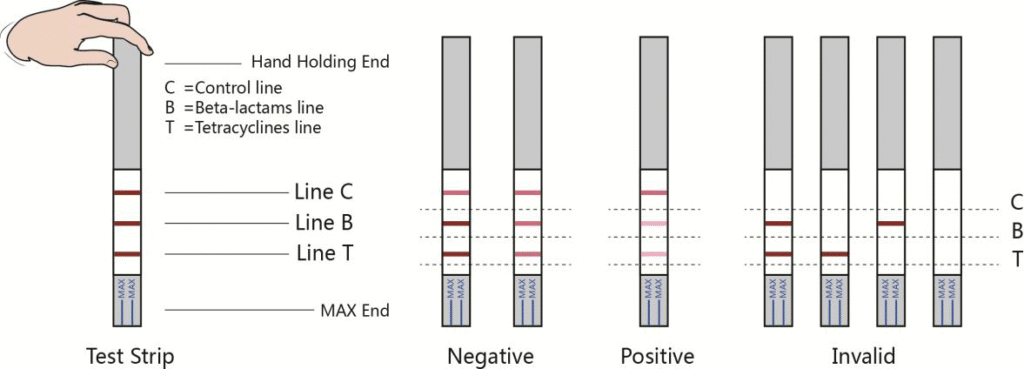3 خط در نوار تست وجود دارد ، خط اول خط کنترل ، خط دوم بتالاکتام و خط سوم تتراسایکیلین ، که به طور خلاصه به عنوان T ,β , C استفاده می شود. نتایج آزمون به رنگ این خطوط بستگی دارد. نمودار زیر شناسایی نتیجه است.