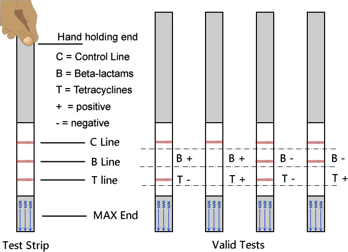4 درصورتی که خط B و T هر دو تشکیل نگردد این بدان معنی است که وجود بتالاکتام وتتراسایکیلین هر دو مثبت و یا به عبارتی بقایای آنها در نمونه تست شده بالاتر ازمیزان تعیین شده در جدول مربوطه میباشد.